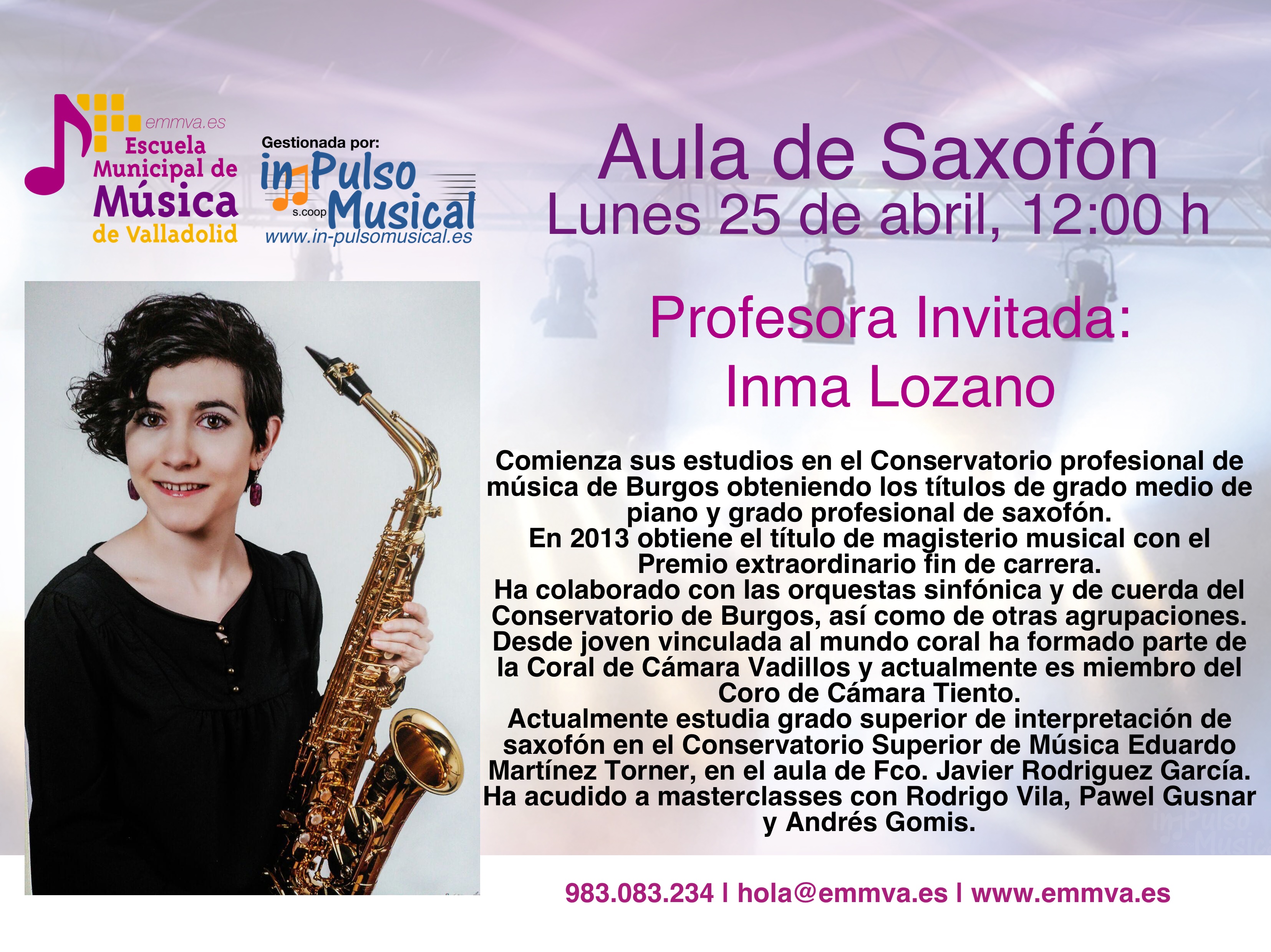 El lunes 25 de abril a las 12:00 h el aula de Saxofón contará con la presencia de la profesora invitada Inma Lozano, quien realizará una actividad muy enriquecedora para los alumnos de Saxofón de la Escuela Municipal de Música de Valladolid.