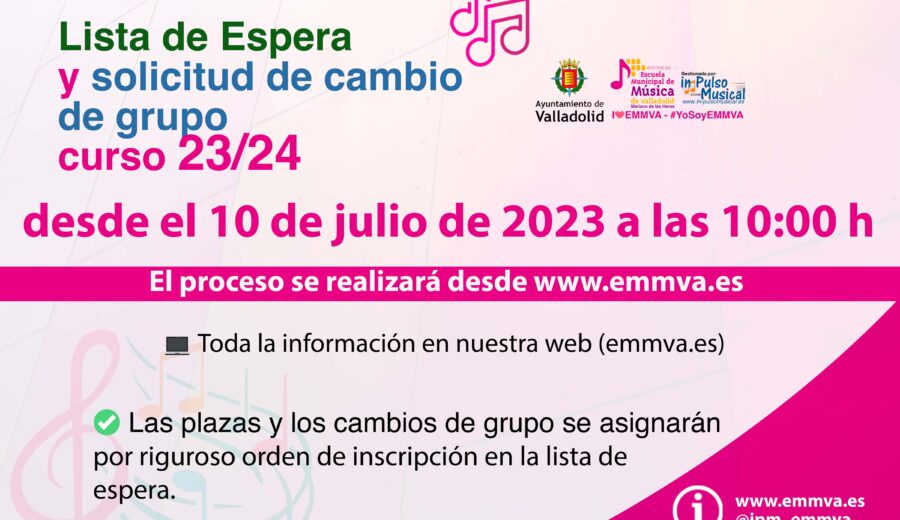 La Escuela Municipal de Música “Mariano de las Heras” del Ayuntamiento de Valladolid convoca pruebas de acceso para la Banda y el Coro EMMVA. Las pruebas para el curso 2023/2024 se celebrarán los días 6 y 7 de octubre en las instalaciones de la escuela situadas en C/ Joaquín Velasco […]