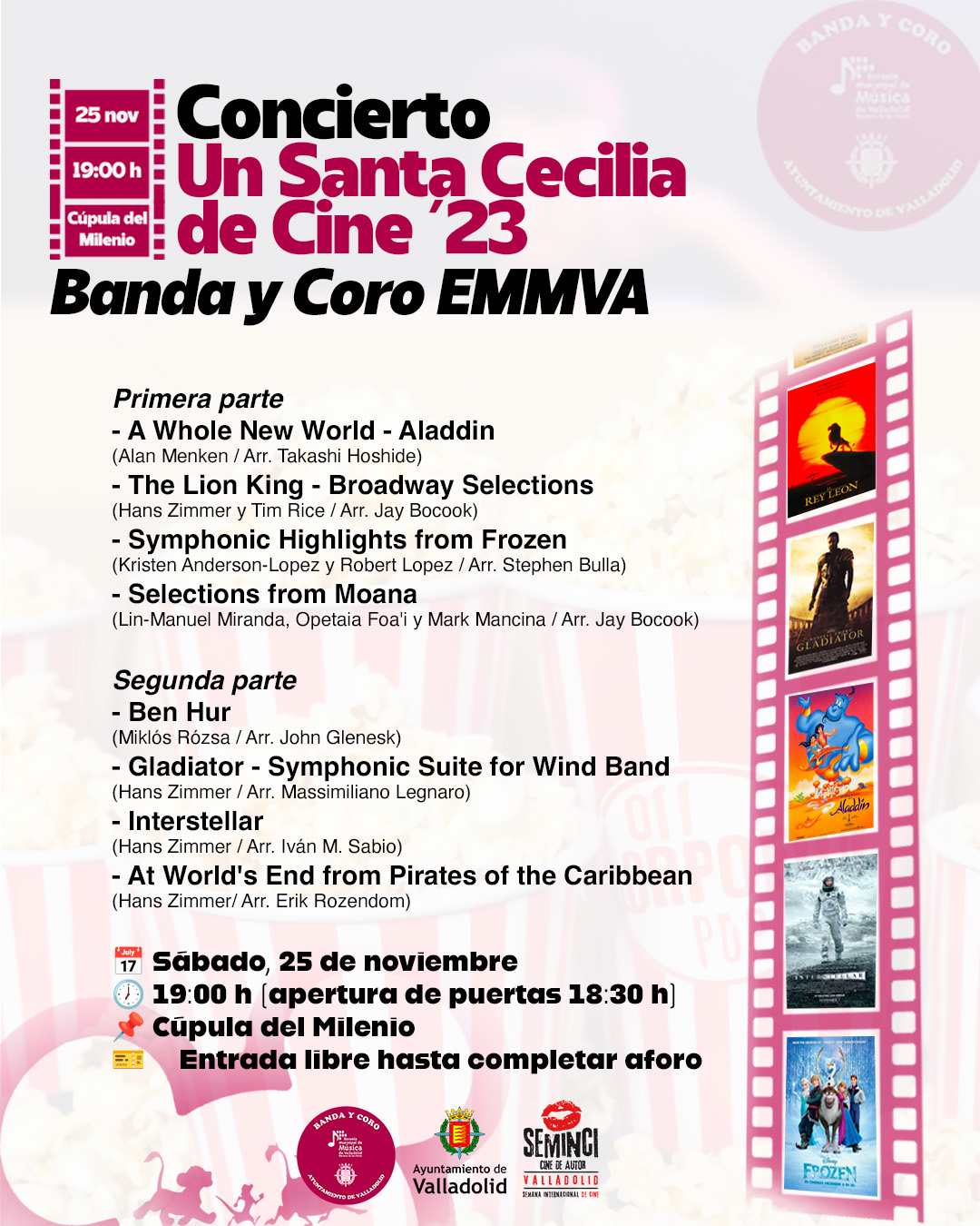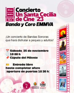 La Banda y el Coro de la Escuela Municipal de Música “Mariano de las Heras” del Ayuntamiento de Valladolid, ofreció un concierto de Bandas Sonoras el sábado 25 de noviembre a las 19:00 h en la Cúpula del Milenio de Valladolid, con motivo de la celebración de Santa Cecilia, Patrona de la Música.