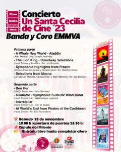 • Concierto de Santa Cecilia 2023 – Banda y Coro EMMVA: 25 de noviembre a las 19:00 h en la Cúpula del Milenio 6 noviembre, 2023