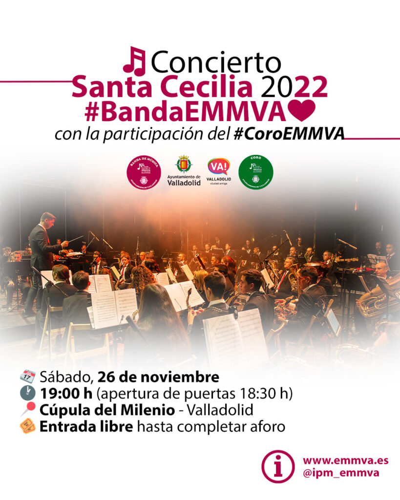 La Banda de la Escuela Municipal de Música «Mariano de las Heras» del Ayuntamiento de Valladolid, Banda EMMVA, ofreció el sábado 26 de noviembre un concierto con motivo de la celebración de Santa Cecilia, Patrona de la Música, contando con la participación del Coro de la Escuela.