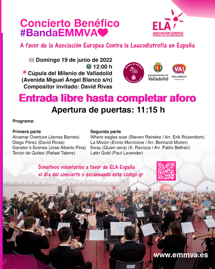 La Banda de la Escuela Municipal de Música “Mariano de las Heras” del Ayuntamiento de Valladolid, Banda EMMVA, ofrecerá el domingo 19 de junio a las 12:00 h (apertura de puertas a las 11:15 h) en la Cúpula del Milenio de Valladolid, un concierto solidario a favor de ELA España.