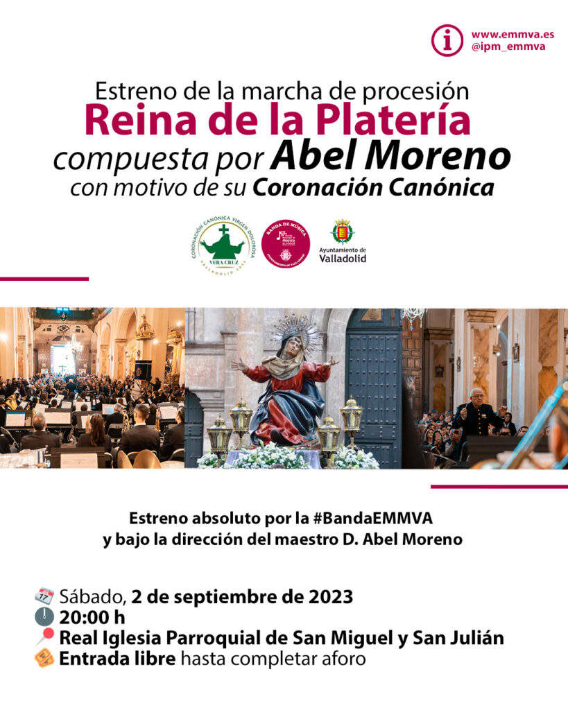 La Banda de la Escuela Municipal de Música “Mariano de las Heras” del Ayuntamiento de Valladolid, Banda EMMVA, tendrá el honor de realizar el estreno absoluto de “Reina de la Platería” marcha de procesión compuesta por el Maestro Abel Moreno, con motivo de la Coronación Canónica de la Virgen Dolorosa de la Vera Cruz.