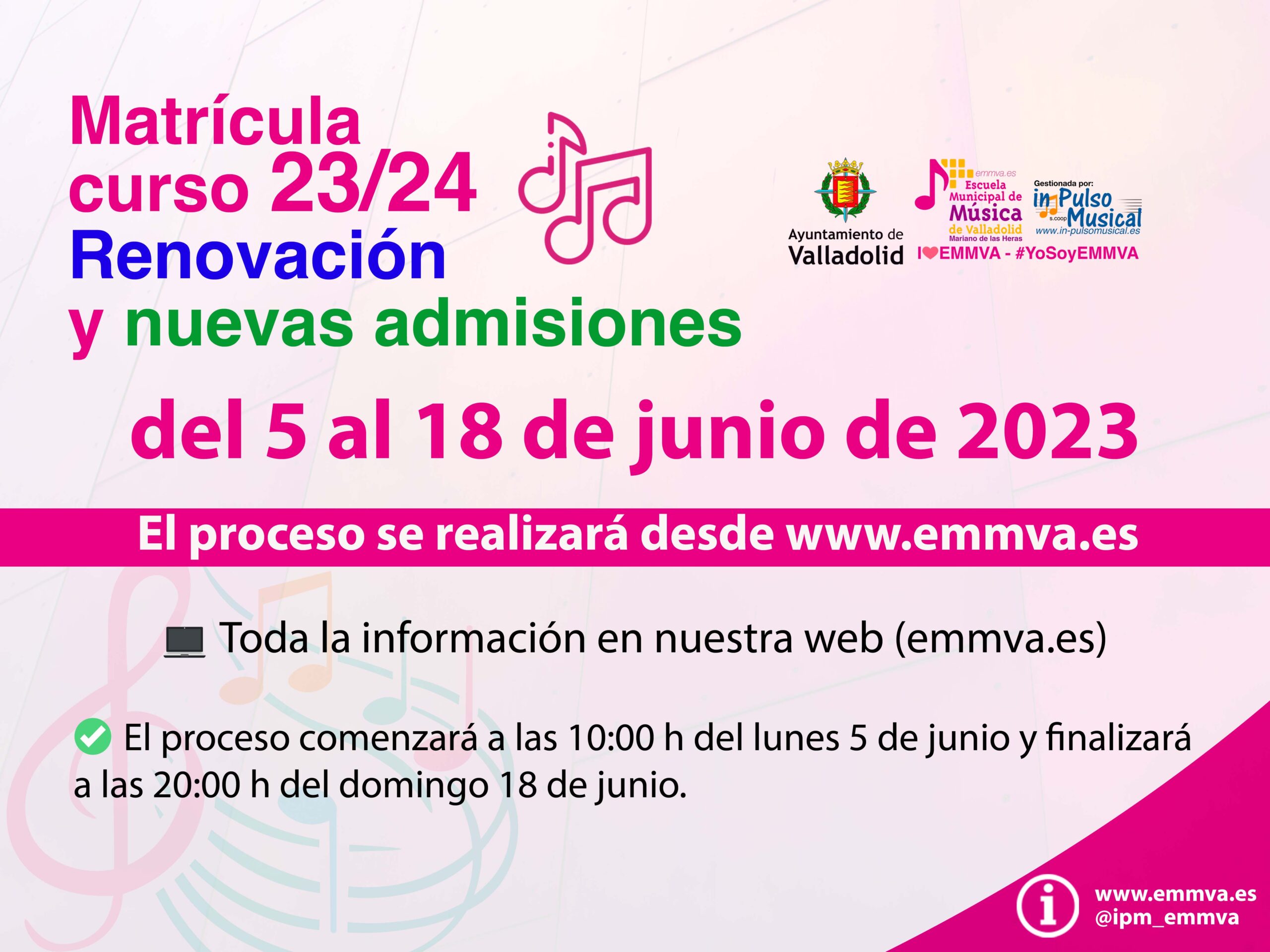 La información detallada sobre el proceso de matriculación, así como la información sobre los horarios y la programación, está a disposición en la siguiente página web: https://prueba.emmva.es/matricula/