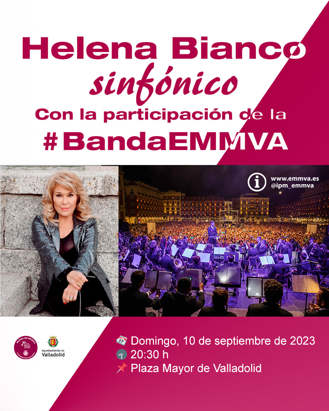 El domingo 10 de septiembre a las 20:30 h en la Plaza Mayor, la Banda EMMVA actuará junto a Helena Bianco en un Concierto Sinfónico con el que se cierra la programación de fiestas de este año.