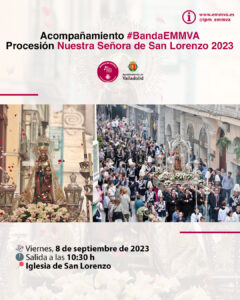 El viernes 8 de septiembre, y como viene haciendo desde el año 2019, la Banda tendrá el honor de acompañar a la Virgen de San Lorenzo en la procesión que partirá a las 10:30 h de la Iglesia de San Lorenzo.