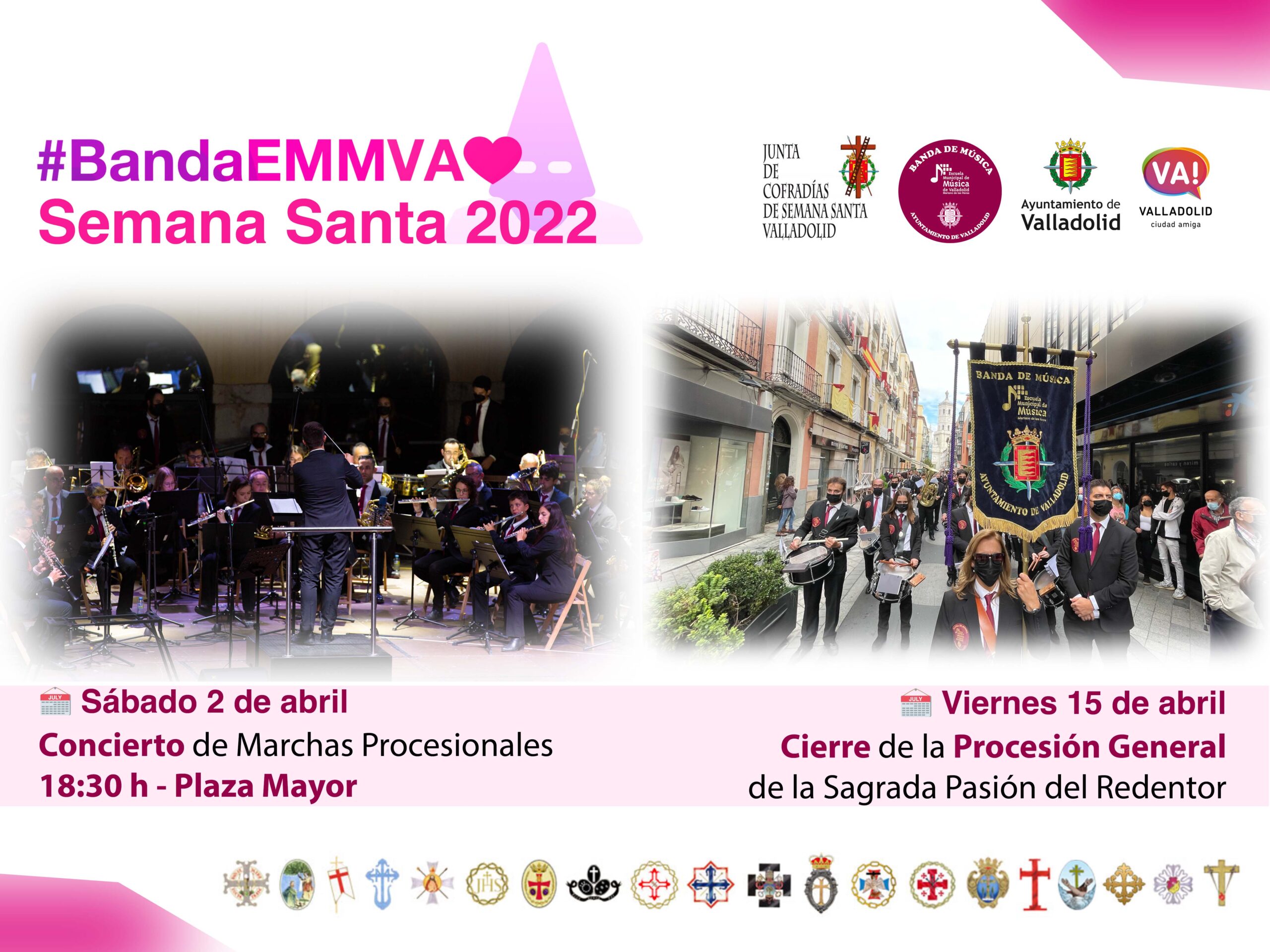 Dentro de los actos organizados por la Junta de Cofradías de Semana Santa de Valladolid, la Banda EMMVA ofrecerá también un concierto de marchas procesionales que se celebrará el sábado 2 de abril a las 18:30 h en la Plaza Mayor, dirigido a todos los ciudadanos que quieran disfrutar de la música de Semana Santa.
