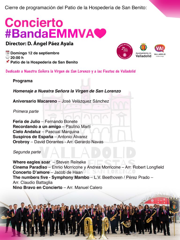 La Banda de la Escuela Municipal de Música “Mariano de las Heras” del Ayuntamiento de Valladolid, ofrecerá este domingo 12 de septiembre a las 20:00 h un concierto en el Patio de la Hospedería de San Benito con el que se cerrará la programación de las fiestas de Valladolid en este recinto.