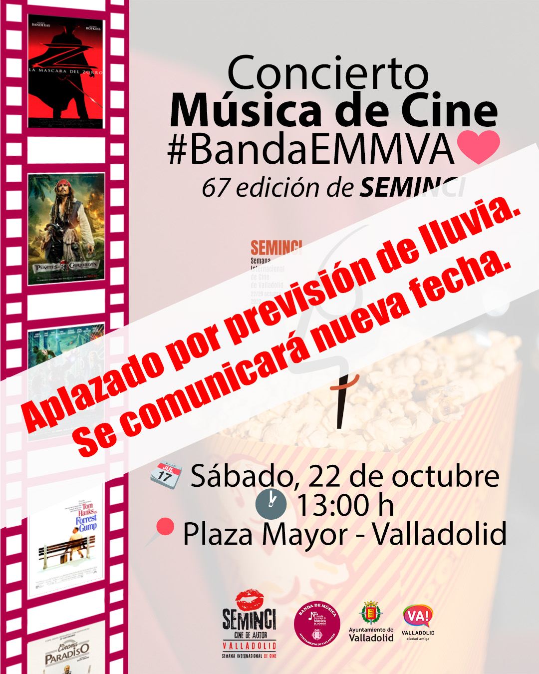 La Banda de la Escuela Municipal de Música “Mariano de las Heras” del Ayuntamiento de Valladolid, Banda EMMVA, ofrecerá el próximo sábado 22 de octubre a las 13:00 h en la Plaza Mayor de Valladolid, un concierto de Bandas Sonoras como parte de las actividades organizadas en el marco de la 67 edición de SEMINCI.
