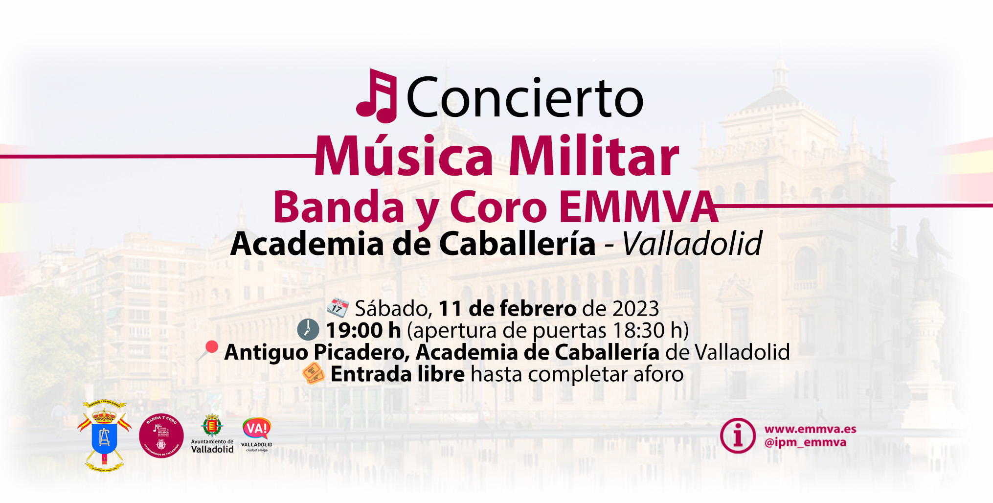 La Banda de la Escuela Municipal de Música “Mariano de las Heras” del Ayuntamiento de Valladolid, Banda EMMVA, dirigida por Ángel Páez, acompañados por el Coro de la Escuela, dirigido por Natalia Abad, celebrarán un concierto de música militar el sábado 11 de febrero a las 19:00 h en el Antiguo Picadero de la Academia de Caballería de Valladolid.