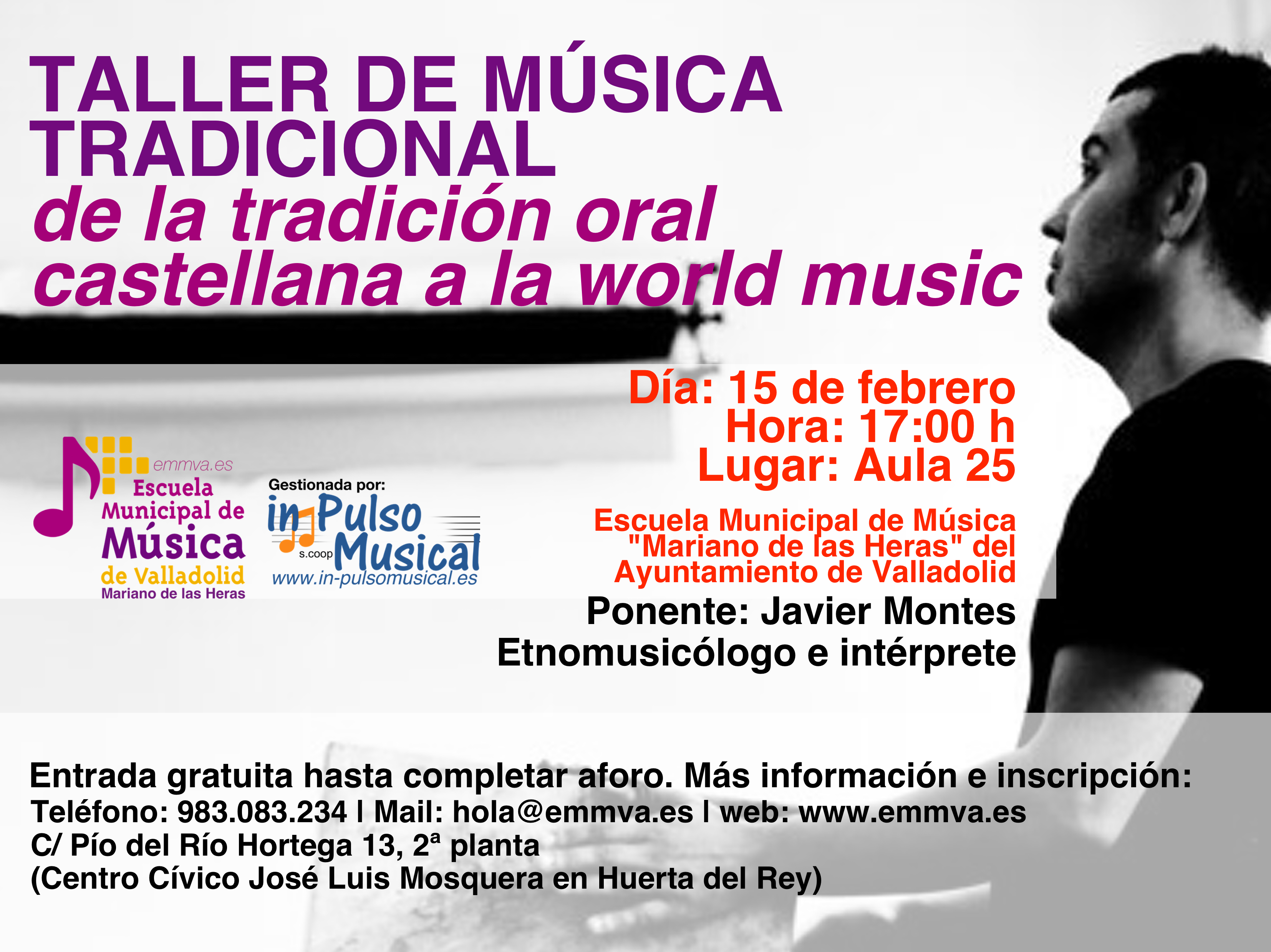 El miércoles 15 de febrero a las 17:00 h, la Escuela Municipal de Música “Mariano de las Heras” del Ayuntamiento de Valladolid celebrará un Taller sobre Música Tradicional en el que el Tamborilero y Etnomusicólogo salmantino Javier Montes acercará la música tradicional a los alumnos.