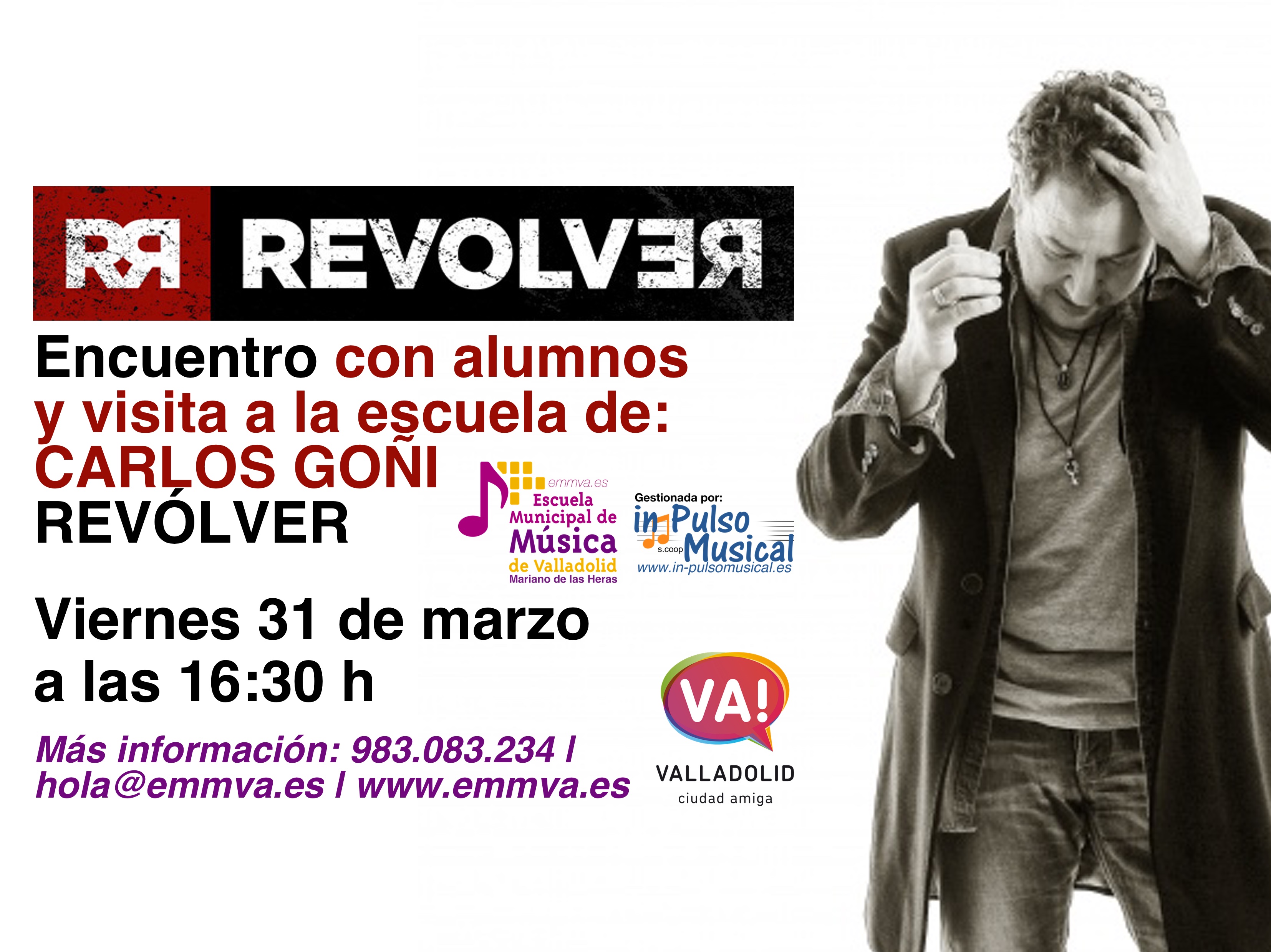 El viernes 31 de marzo a las 16:30 h, la Escuela Municipal de Música “Mariano de las Heras” del Ayuntamiento de Valladolid recibirá la visita de Carlos Goñi de Revólver aprovechando su visita a Valladolid con motivo del concierto que ofrecerá en el Teatro Carrión.