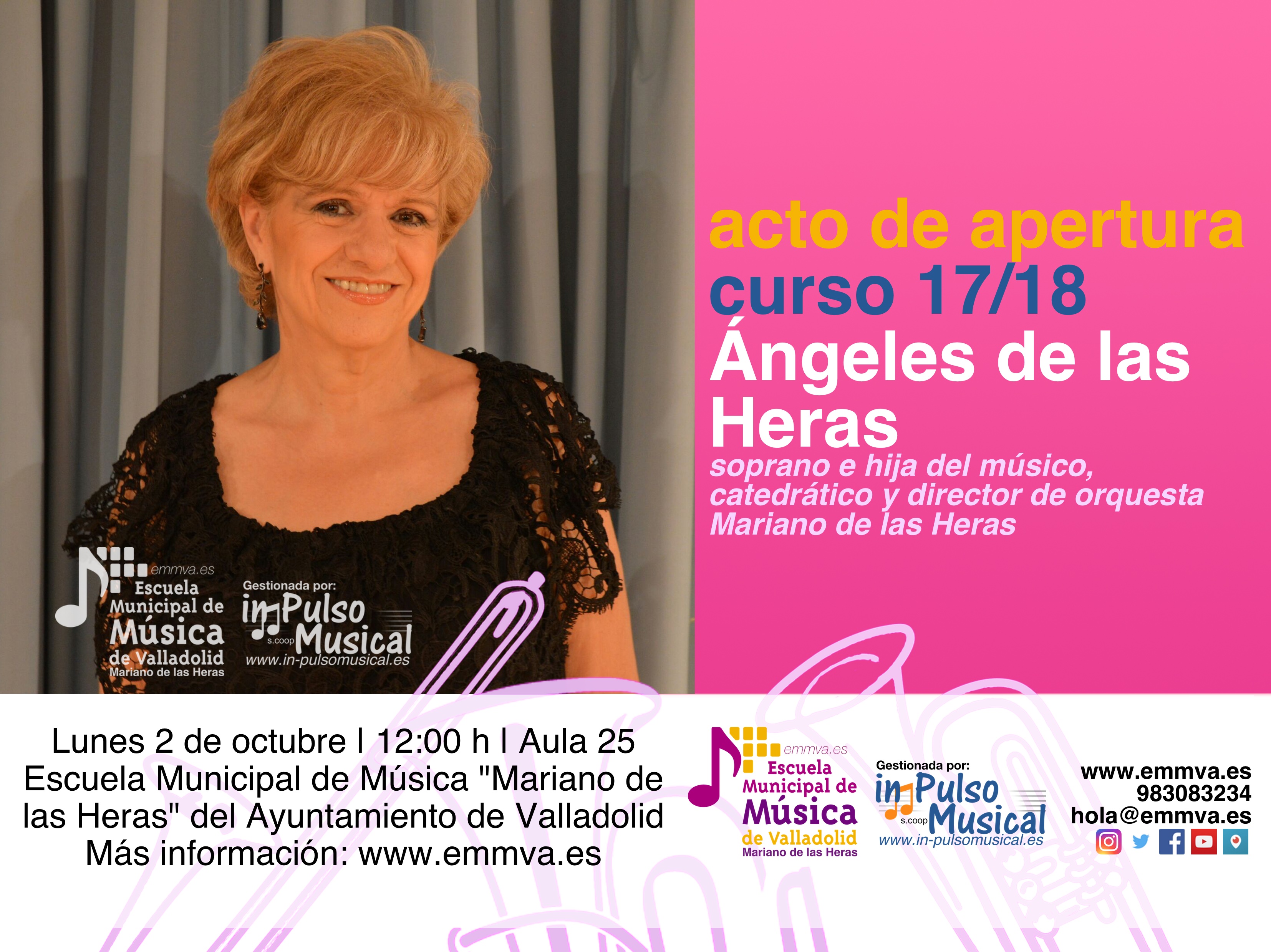 La Escuela Municipal de Música “Mariano de las Heras” del Ayuntamiento de Valladolid celebrará el lunes 2 de octubre a las 12:00 h el acto de apertura del curso 2017/2018 en el que Ángeles de las Heras, hija del músico, catedrático y director de orquesta Mariano de las Heras, realizará un repaso a la figura de su padre, su trayectoria profesional y su influencia cultural en la ciudad de Valladolid en un evento en el que también participará el Dj vallisoletano Óscar de Rivera.