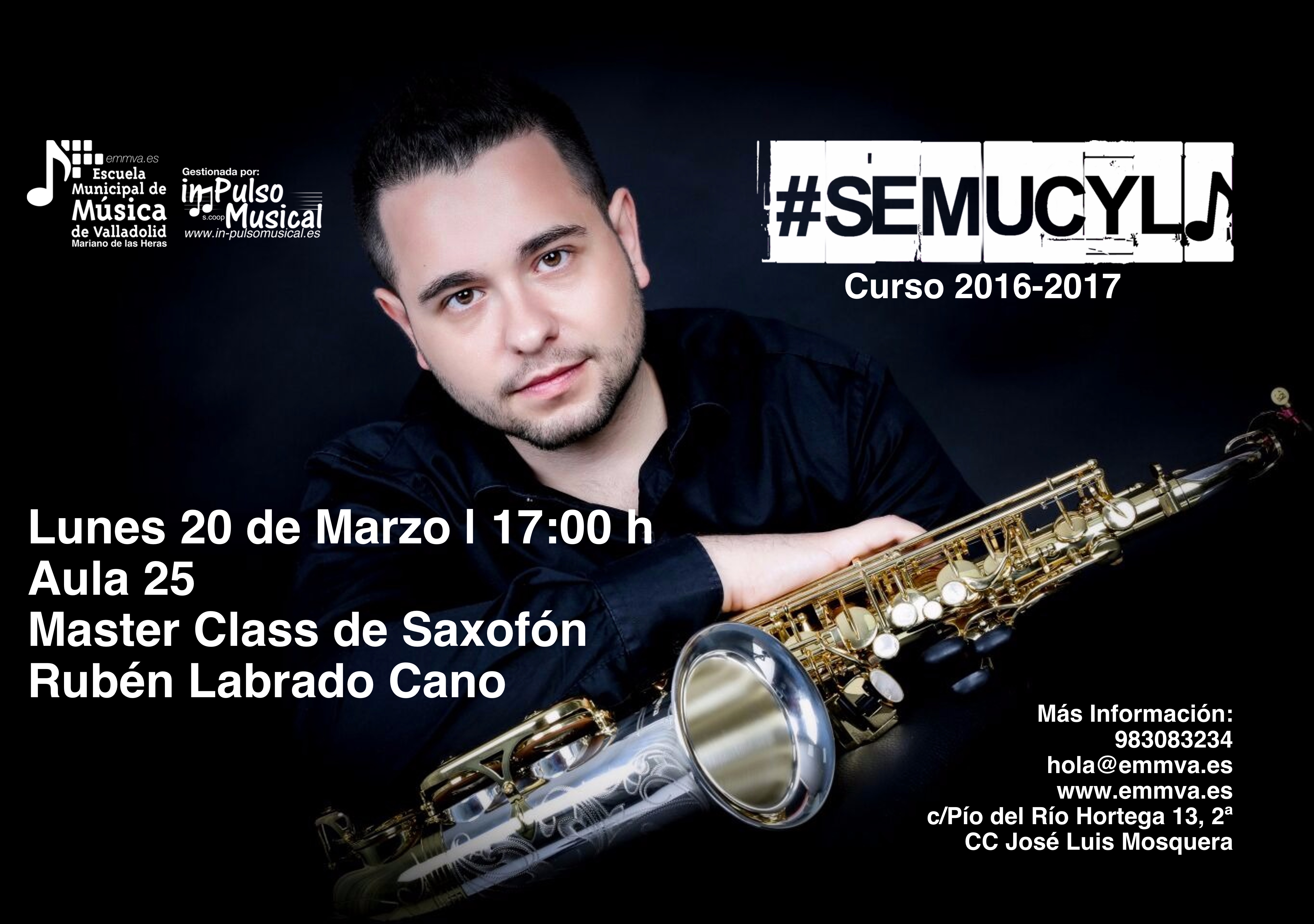 La Escuela Municipal de Música “Mariano de las Heras” del Ayuntamiento de Valladolid celebrará el lunes 20 de marzo a las 17:00 h en el Aula 25, una Master Class de Saxofón dentro de las actividades previstas en la IV edición de #SEMUCYL.