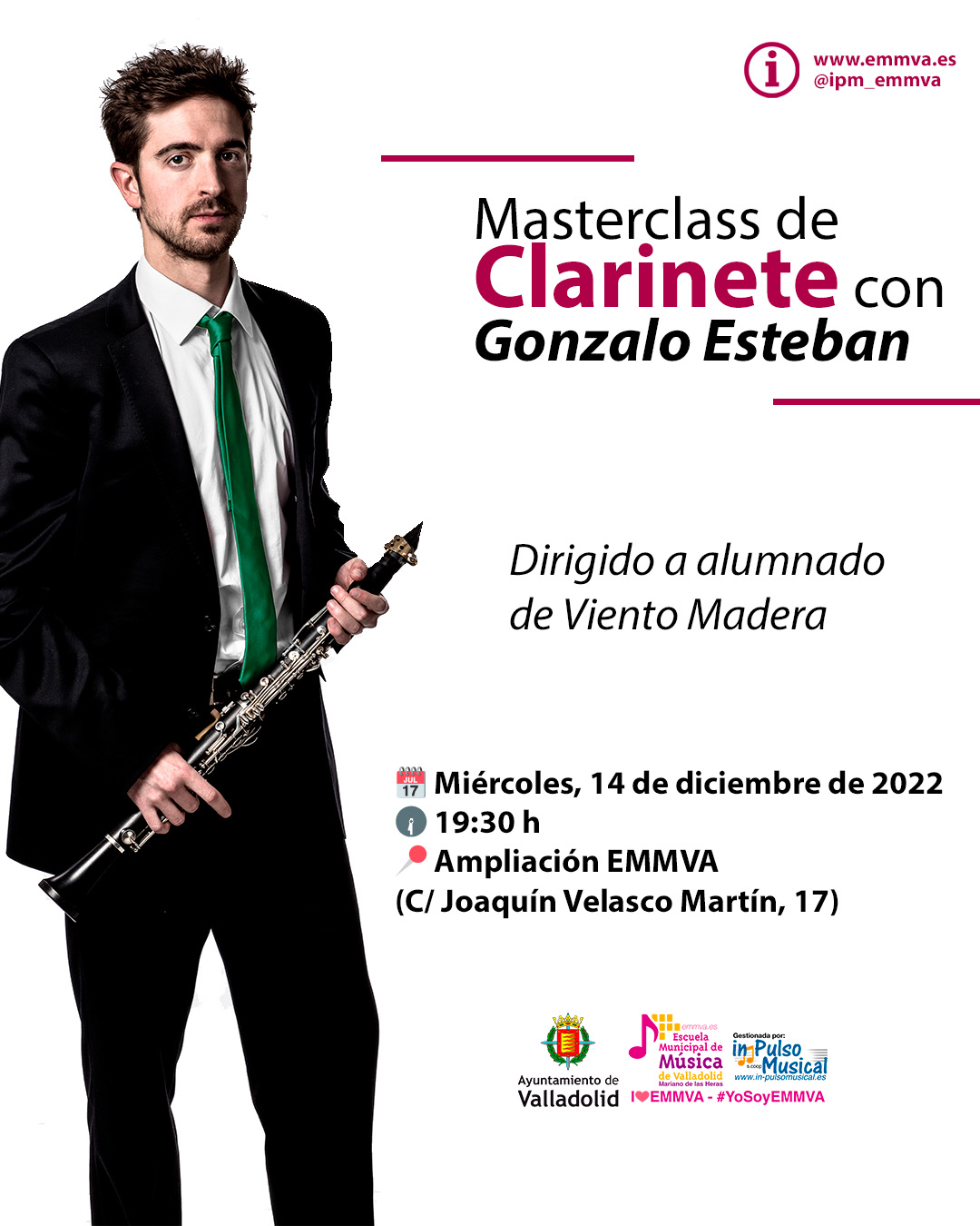 El miércoles 14 de diciembre a las 19:30 h en la Ampliación EMMVA (C/ Joaquín Velasco Martín 17 ver ubicación aquí) el Clarinetista Gonzalo Esteban ofrecerá una Masterclass de Clarinete dirigida a alumnado de Viento Madera.