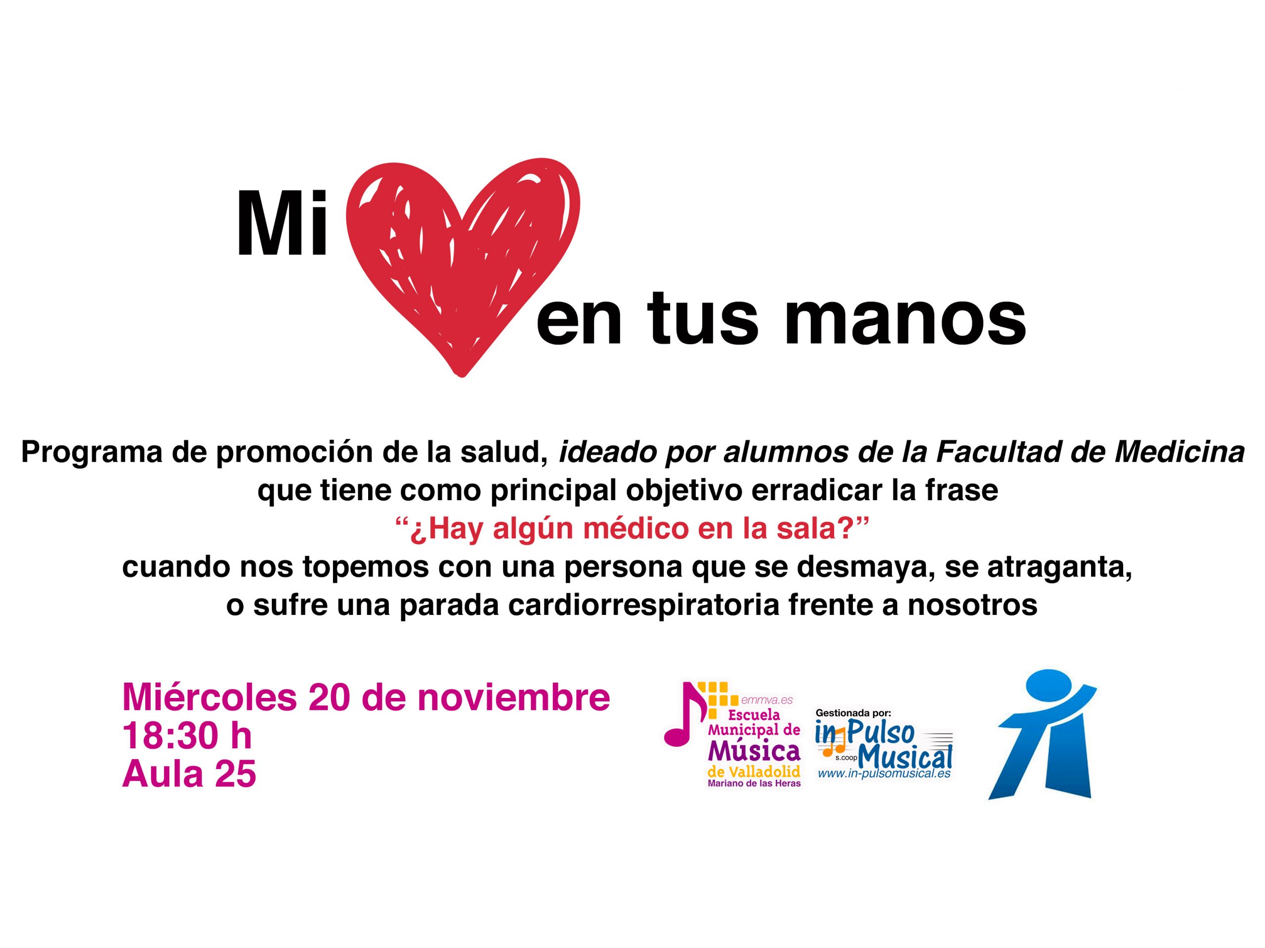 Desde la Escuela Municipal de Música “Mariano de las Heras” del Ayuntamiento de Valladolid, y el Departamento de Formación de Alumnos Internos (AAII) de la Facultad de Medicina, queremos invitarles a participar en el proyecto “MI CORAZÓN EN TUS MANOS”.