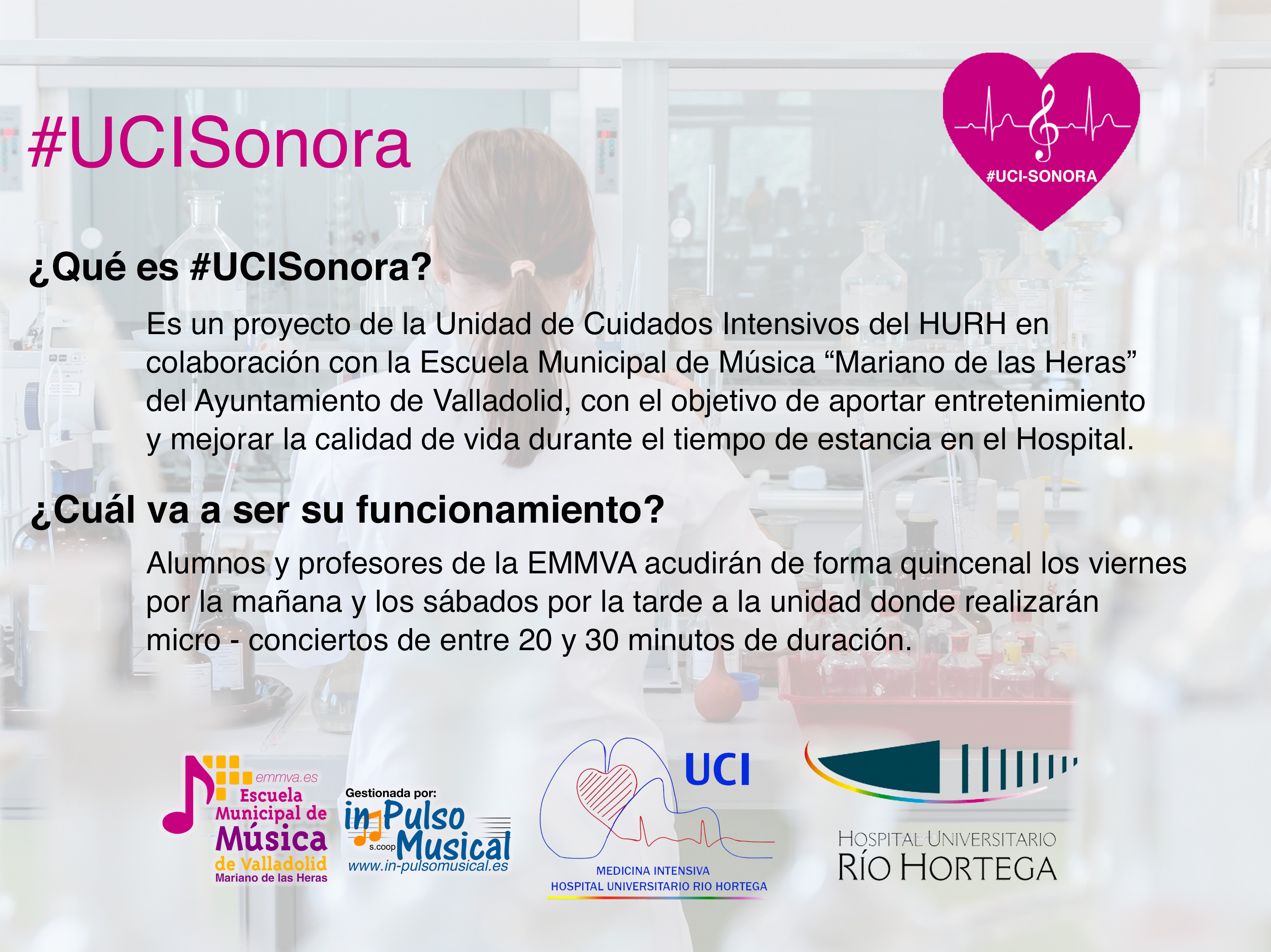 La Escuela Municipal de Música «Mariano de las Heras» del Ayuntamiento de Valladolid, y la Unidad de Cuidados Intensivos del Hospital Universitario Río Hortega de Valladolid, iniciarán este viernes el proyecto #UCISonora que tiene como objetivo aportar entretenimiento y mejorar la estancia de estos pacientes en el hospital.
